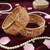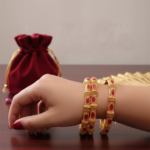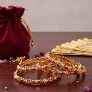 Enhance your beauty with these Luxury Golden Bangles, delicately crafted with fine detailing and adorned with striking red stones. The intricate golden design adds a royal charm, making these bangles perfect for weddings, festive occasions, and parties. Designed to pair beautifully with both traditional and modern attire, they bring grace, style, and elegance to every look. Lightweight and comfortable, these bangles are a timeless addition to any jewelry collection.